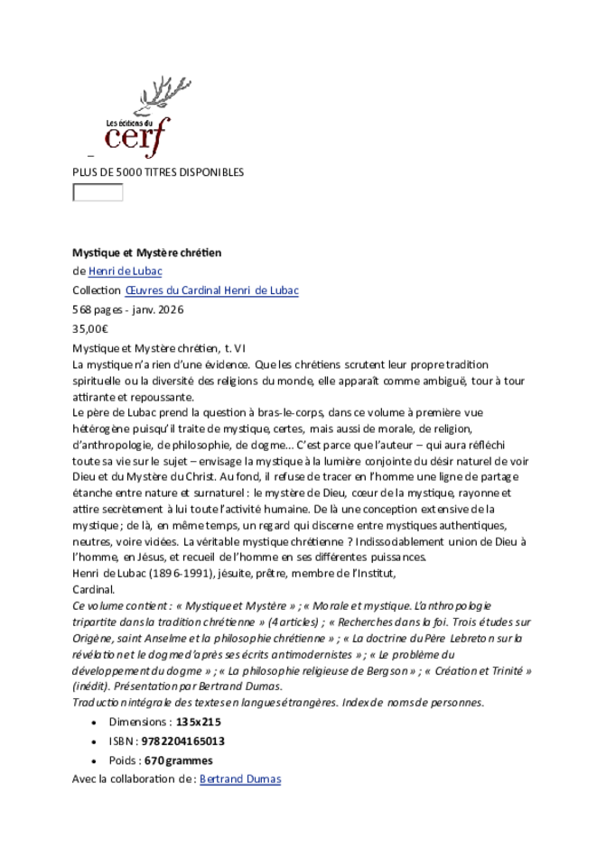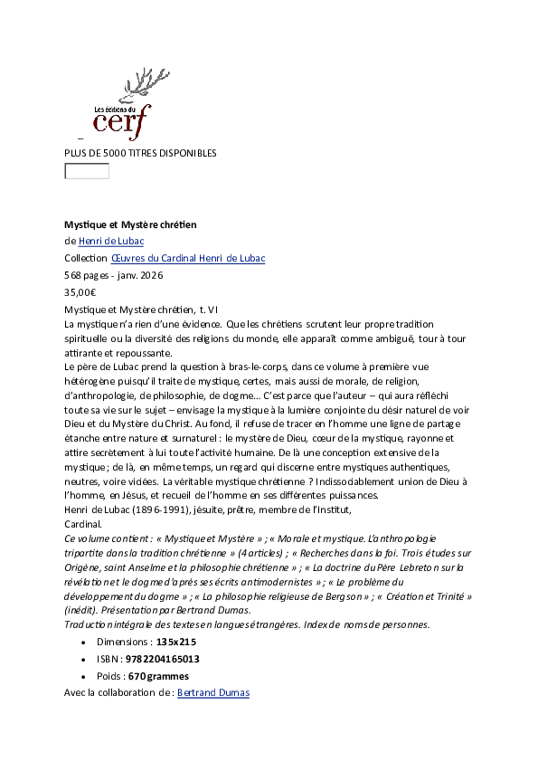 Parution Ouvrage: Mystique et Mystère chrétien de Henri de Lubac Collection Œuvres du Cardinal Henri de Lubac 568 pages - janv. 2026 35 € Mystique et Mystère chrétien, t. VITome de l'éditeur critique des oeuvres de LUBAC