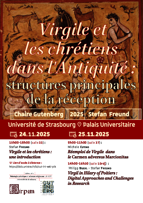 Première rencontre dans le cadre de la Chaire Gutenberg 2025 de M Stefan Freund - du 24 au 25 novembre 2025- 24 novembre 2025 -Virgile et les Chrétiens dans l'antiquité: Structures principales de la réception- Au Palais Universitaire de l'Université de Strasbourg (Salle 33 le 24 nov 2025) et (Salle 37 le 25 nov 2025). Organisée par Stefan FREUND et Michele CUTINO Fichier(s) lié(s) Nom du fichier : Presentazione standard di PowerPoint Extension du fichier : pdf Poids du fichier : 986 Ko