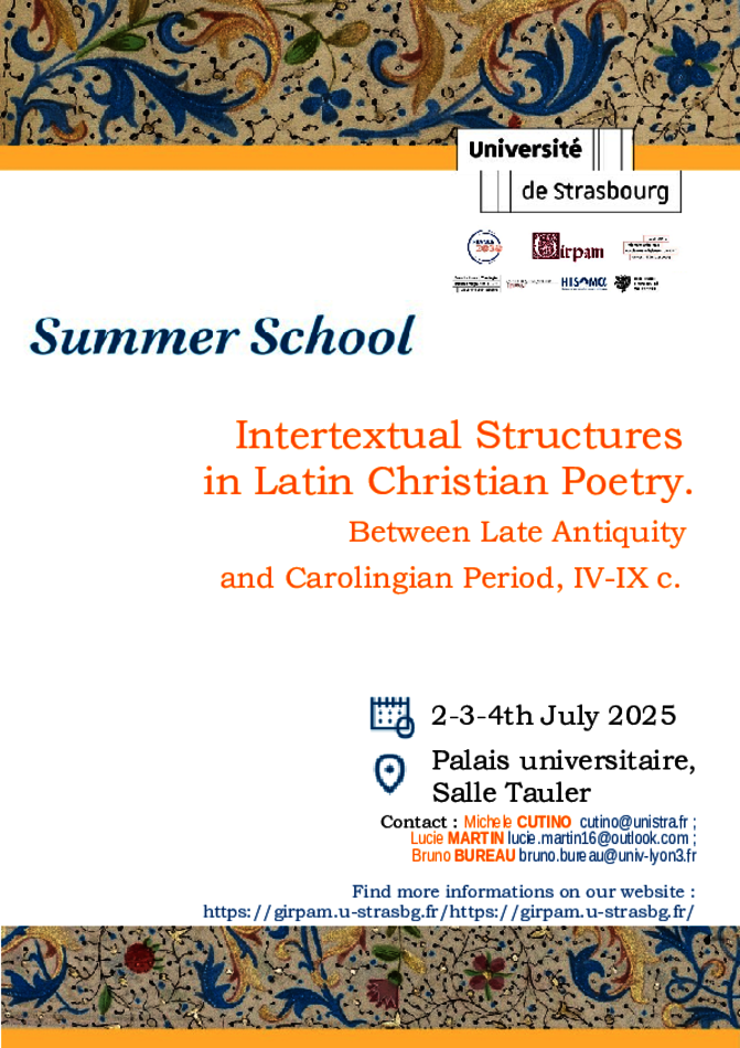 Summer School: Intertextual Structures in Latin Christian Poetry. Between Late Antiquity and Carolingian Period, IV-IX C.; Organisé par Michele CUTINO; Lucie MARTIN et Bruno BUREAU, du 02 au 4 juillet 2025 dans la Salle Tauler du Palais Universitaire de l'Université de Strasbourg
